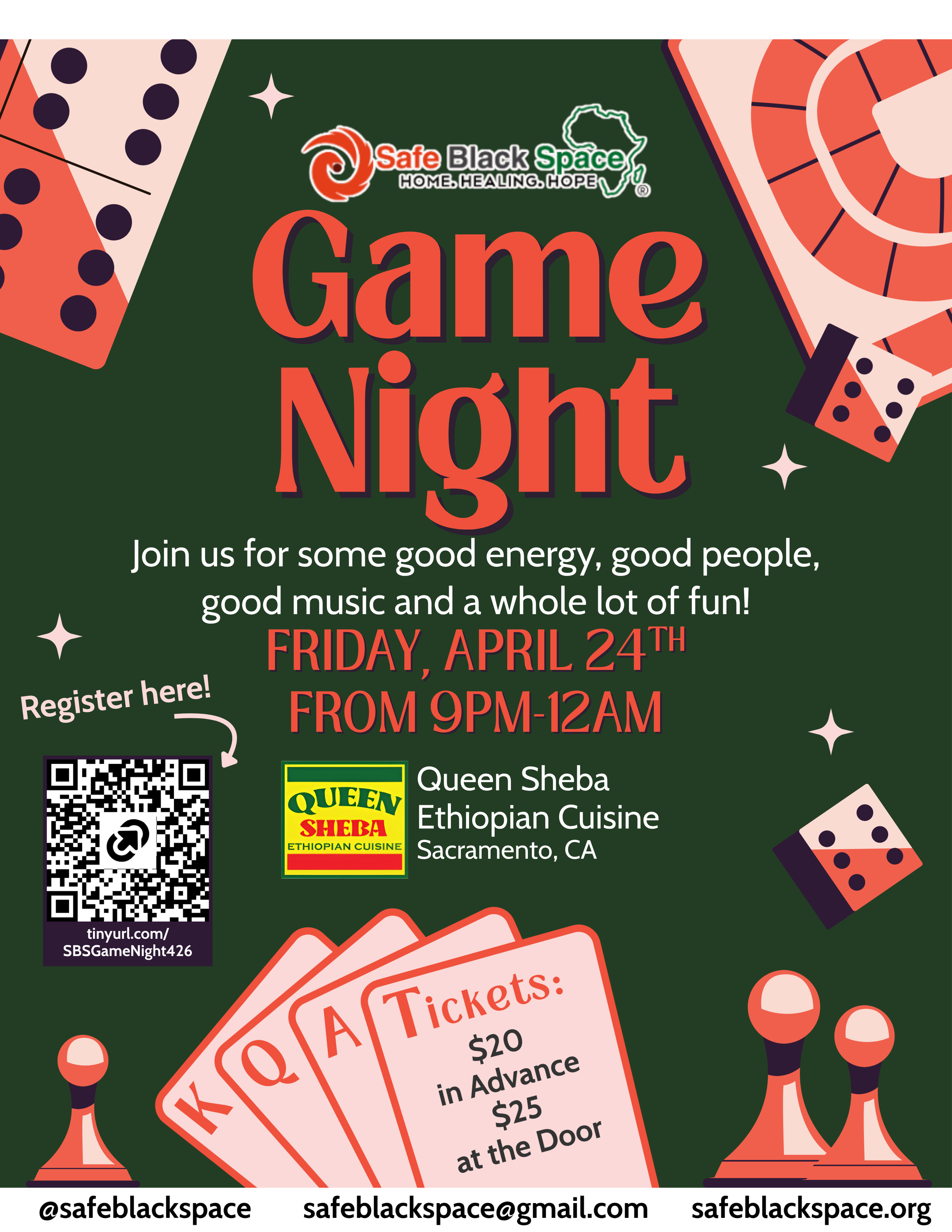 We’re taking over Queen Sheba Ethiopian Restaurant for the night with board games, card games, music, and space to connect. Expect a mix of classics like Uno, Spades, Dominoes, and more, plus room to just hang out, grab food or drinks, and enjoy the vibe.